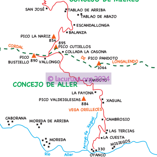 Desde la cumbre descendemos hacia el O., para alcanzar la collada la Fuexa y continuar toda la sierra hacia el collado Piorneu por donde bajamos por el «Camín Real» al valle de Villarín, recorriendo las diversas brañas, con cabañas diseminadas por toda la ladera sur del Michu (la Piedra, la Estaca, el Pozo,…), para llegar al núcleo rural de la Falguera donde tomamos una pista que nos conduce a la localidad de Veigas (765 m.), donde finalizamos esta salida.