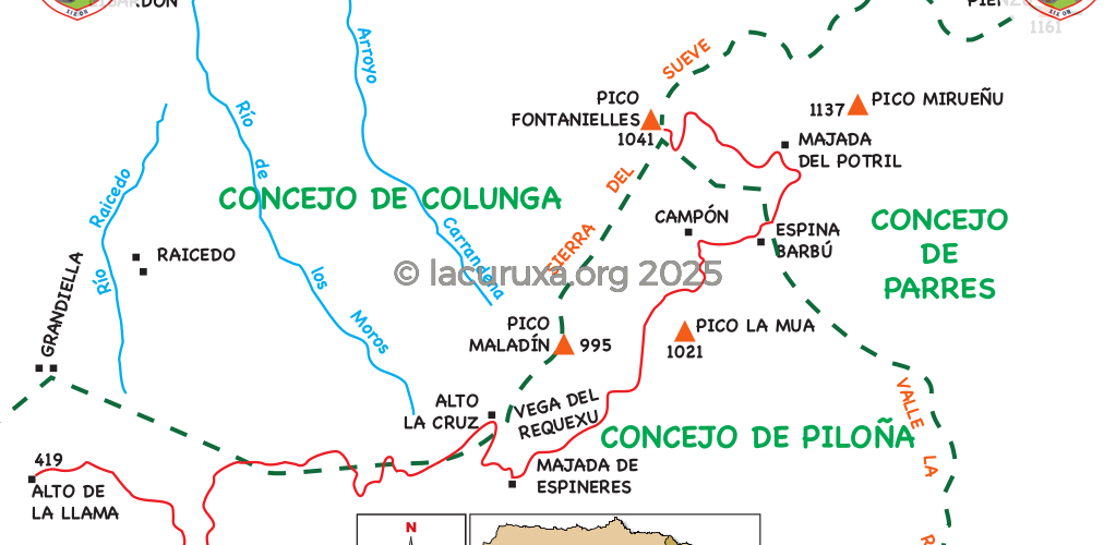 Iniciamos esta salida en el Alto de la Llama (419 m), donde tomamos una pista ganadera que sale por el E, va remontando entre praderías y arbolado; pronto la pista se empina en una sucesión de revueltas, alcanzamos la fuente el Llovetu y la cabaña de Sames, asentada en una hermosa pradera; recorremos un tramo bastante llano para volver a tomar altura salvando el desnivel con varias revueltas, que van dando vista a tierras de los concejos de Colunga y Piloña, hasta alcanzar el Alto la Cruz. A partir de aquí el camino se suaviza, rodeado de praderías, donde abundan las matas de espino.