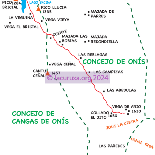 Desde aquí seguimos con rumbo SSE. por el sendero que sube a la majada de Cuerria Benita para entrar por la canal que roza por la derecha con los paredones del Porru LLagu; más adelante afrontamos las pendientes camperas de LLampa Cimera. El camino se bifurca tomando rumbo E. hacia el Jou Santu desde donde afrontamos un nuevo repecho que nos conduce al collado de la Fragua ( 1820 m.) .