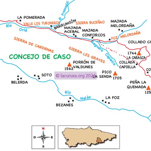 En el alto la Colladona (845 m.) comenzamos esta salida, siguiendo un sendero muy marcado que se eleva al SE., luego gira al NE., y nos sitúa por debajo de una collada. Tomamos el camino ascendente de la izquierda que nos conduce al espacioso rellano de la Vega Llao (978 m.), por aquí pasamos a la forestada ladera al norte del cordal y en cómoda remontada al E., rodeamos la cumbre rebasándola, luego retrocediendo un poco al O., alcanzamos el primer vértice importante de la sierra, el Pico Fermosu (1058 m.). Descendemos hacia ESE., hasta desembocar en la collada Frieres, aquí llega una pista por la que continuamos al SE., situándonos enseguida en la cabaña alta de La Espina.