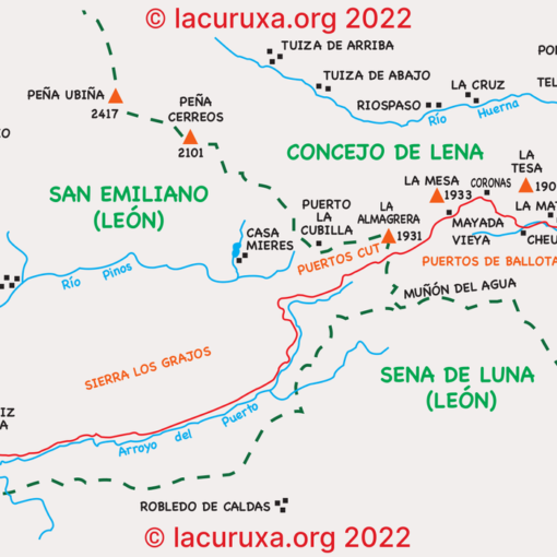 El descenso es a través de la Sierra de la Corredoria por sendero poco marcado hasta el Boquín de Ancares (1600 m.). Aquí encontramos la pista que une el valle de Fornela con el valle de Ancares. Seguimos la pista en dirección Guímara (Fornela). Enseguida entramos en el Campo de la Pesca con buen refugio de piedra y tejado de pizarra. Una fuente abundante de agua cristalina no puede faltar en este paraje privilegiado, que ha elegido el río Cúa como lugar de nacimiento. A la izquierda está el puerto de Cienfuegos (1610 m.) con pista de tierra accesible a vehículos con destino al concejo de Ibias.