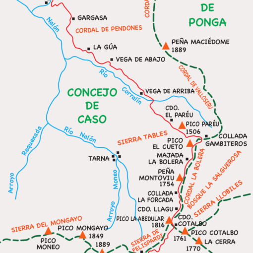 La senda se eleva por la ladera septentrional que serpentea, con grandes lazadas, hasta culminar en la vega de les Capilles (900 m.). A mitad del camino pasamos junto a una gran piedra a manera de mirador, asomándose al valle del Caudal. Este histórico lugar es conocido como La Silla del Obispo, ya que según la leyenda, allí se sentó el obispo Toribio para descansar cuando era portador de las Santas Reliquias.