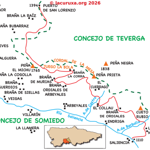 Comenzamos esta salida junto al Serida (Centro de Biotecnología Animal), a 250 m. de altitud, un poco más arriba del cementerio de Deva, de donde parte una pista que nos adentra en el monte de Deva y otra que nos lleva al Valle de Rioseco. Descendemos por esta última acercándonos al arroyo que da nombre al valle y que normalmente está seco. El valle discurre entre los cordales de Deva y Baldornón (en asturiano «Valdornón”). A lo largo del mismo nos vamos a encontrar con tres lugares a los que presta su nombre el arroyo: Rioseco de Deva, Rioseco de Caldones y Rioseco de Baldornón. Este pequeño arroyo de exiguo caudal, que nace en la falda del Pico Fariu, recorre unos ocho km. recogiendo regatos antes de verter sus aguas en el corto Río de Vega, que a su vez las deposita en el Río España.