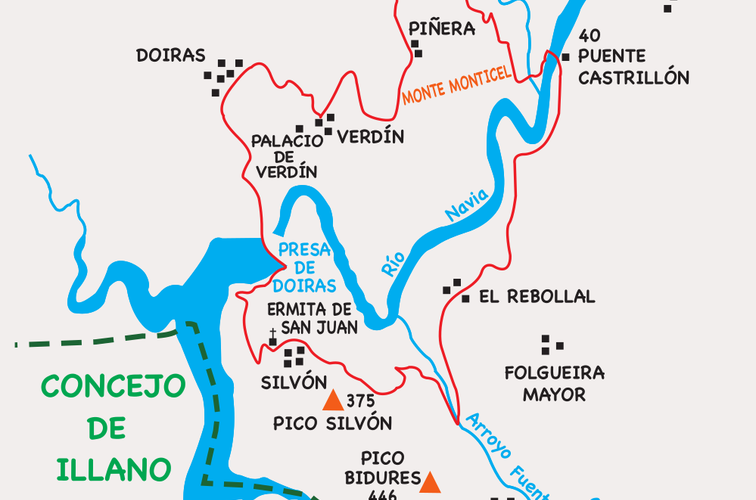 Iniciamos la salida en el área recreativa de Castrillón, en Boal (40 m), cruzando el puente del mismo nombre; tras recorrer unos metros por carretera, tomamos una pista a la derecha que nos conduce, en ligero ascenso, al Rebollal, solitario pueblo, con casas y pequeños edificios de piedra y pizarra negra, de interés etnográfico; la senda está bien señalizada, con hermosas vistas sobre el profundo cauce del río Navia.