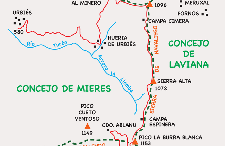 Descendemos hacia el N., por una zona de matorral, hasta adentrarnos en un hayedo; caminamos por su parte alta y llegamos al collado Fonticos. De aquí sale un sendero, hacia el N., que desemboca en una pista, por la que continuamos hacia la derecha hasta llegar a la Campa Espinera. Desde aquí seguimos por la pista de la izquierda, que desciende un poco, hasta enlazar con la que sube de la Hueria de Urbiés. En este punto seguimos por la pista de la derecha, en ascenso, hasta llegar a la Campa Cimera, desde donde ya contemplamos variados paisajes. Aquí abandonamos la pista para ascender al pico Tres Concejos (1096 m), desde donde tenemos una visión de paisajes de toda la geografía asturiana, como la sierra de Peña Mayor, y cumbres de Redes como la Xamoca, Tiatordos, Cogollo, Guanalón, la silueta de Peña Mea, los cordales de Longalendo y de Urbiés y, más al fondo, el Macizo de las Ubiñas, el Aramo y el pico Polio.