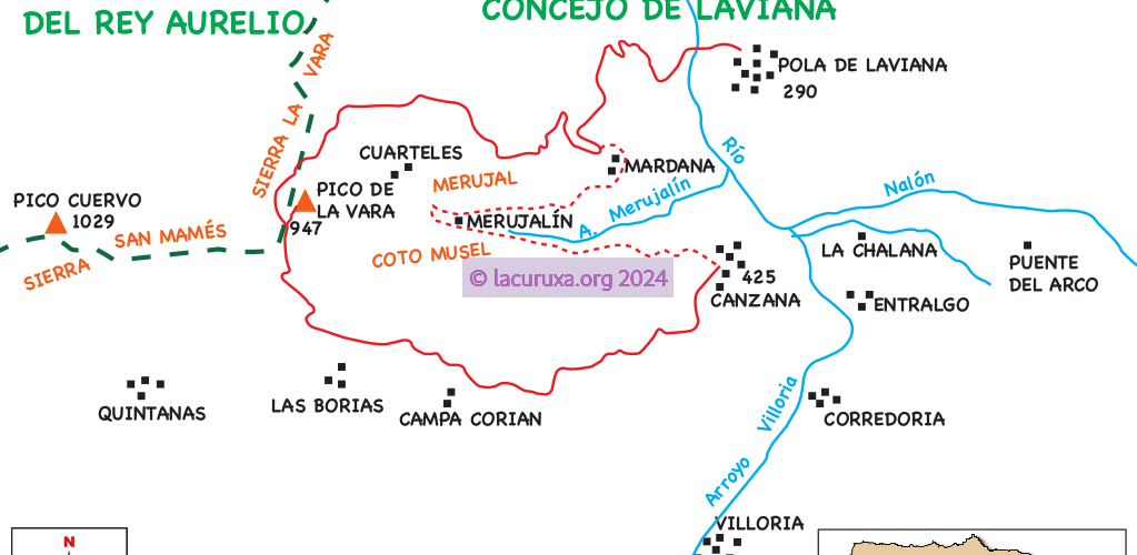 A partir de aquí caminaremos por la antigua vía del ferrocarril minero, hasta llegar a Mardana, que pertenece a la parroquia de Entrialgo. A la entrada del pueblo tomamos una caleya a la izquierda, dirección N, que va ganando altura para convertirse en sendero y nos conduce directos al Pico de La Vara (947 m) del que ya tenemos vista, distinguiéndose la caseta y geodésico allí existentes y que no perderemos hasta llegar a él. El sendero que llevamos pertenece a los llamados Senderos del Carbón, de entre los cuales, el que nosotros seguimos en todo momento, es el** Nº 1.**