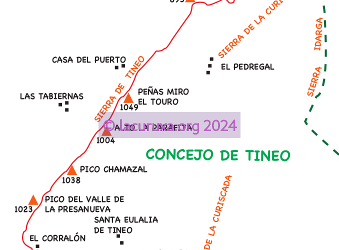 Desde el Alto la Degollada continuamos hacia la izquierda, dirección SO, por todo el cordal, hasta llegar a las Peñas Miro el Touro (1049 m), que es la máxima altura de la Sierra de Tineo. Las vistas, desde esta modesta cumbre, son espectaculares; sierra de Peña Manteca, Sierra de Lagos, Cueto Arbás, Macizo de Ubiñas, Sierra del Aramo, Macizo Occidental de los Picos de Europa, etc..,