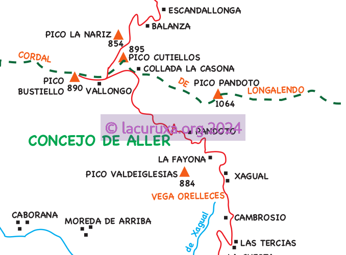 El sendero sigue ahora en diagonal hasta llegar a una bifurcación, seguimos de frente pasando junto a una muria de piedra del prado Vallongo, con una robusta cuadra con techo de llábanas; en poco tiempo alcanzamos la cima del pico Bustiello o la Faya (890 m), las vistas que nos ofrece son hermosas: el cordal de Longalendo, la sierra del Aramo, el macizo de las Ubiñas, el valle de Aller,… Volvemos a la bifurcación, siguiendo un marcado camino que faldea por la derecha el pico Cutiellos, a caballo de los valles de Aller y Turón y nos lleva a la collada la Casona. Aquí descendemos hacia el SO para tomar una pista de tierra, entrando en tierras alleranas, que nos conduce hacia las vegas de Pandoto, pronto enlazamos con otra pista que nos lleva a las cabañas de la Fayona, donde hay una fuente. Seguimos la pista, a mano derecha, que discurre, en un tramo, por el camino viejo que va hacia el pueblo de Xagual, muy cerca se encuentra el núcleo rural de Cambrosio. Tanto Xagual como Cambrosio son ejemplos de pueblos alleranos casi abandonados. Aquí el camino desciende por una zona hormigonada, bastante pendiente, dando vista al pico Moros, llegando a la localidad de Oyanco (330 m), donde finalizamos esta salida.