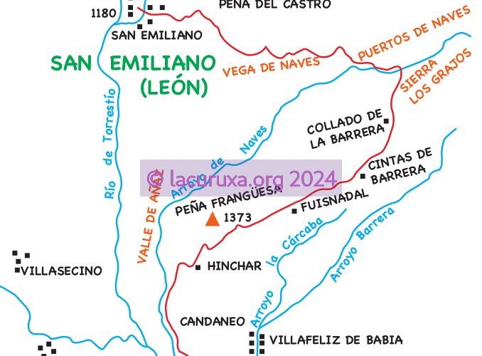Seguimos caminando ahora por un terreno que alterna el roquedo calizo con extensos pastizales, bordeamos la Peña del Castro dando vista al pueblo de San Emiliano y también algunas destacadas cumbres: Montihuero, peña Orniz, Morronegro, Peña Crespa, Picos Blancos,… pasamos una cabaña y una nave ganadera; a nuestra derecha, una vez más, preciosa vista de las Ubiñas; llegamos a un cruce de caminos, giramos a la izquierda, pasamos el cementerio y alcanzamos el pueblo leonés de San Emiliano (1180 m), donde finalizamos esta salida.