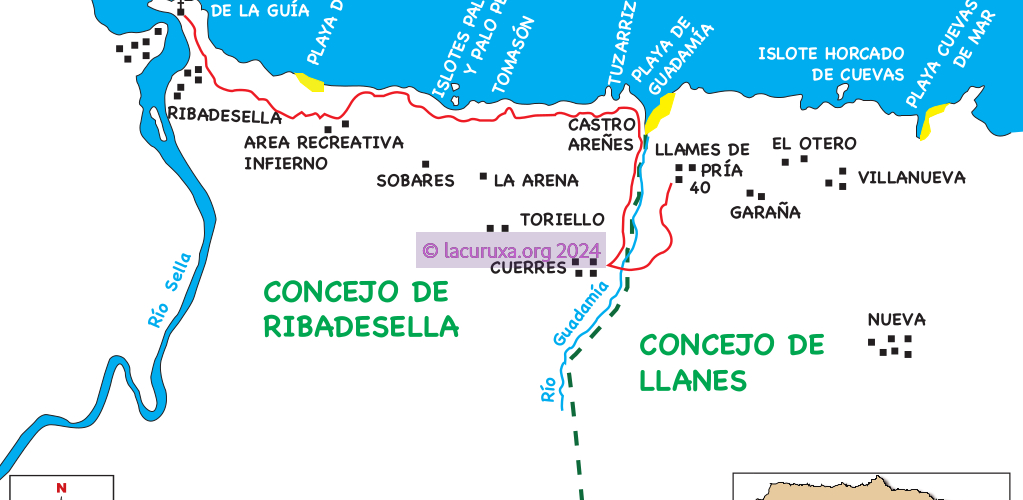 Continuamos nuestro camino al NO, hacia la muy próxima localidad de Ribadesella (6 m). Villa histórica de la Costa Oriental de Asturias; al final del paseo de la Grúa un sendero nos permite subir a la ermita V irgen de la Guía. Desde aquí se domina la entrada al estuario del Sella, siendo el mejor balcón panorámico sobre la ría y su entorno; aquí ponemos punto final a esta salida.