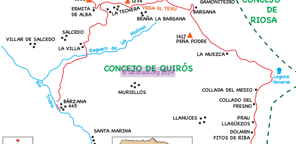 Pronto iniciamos una crestería que nos conduce a la cumbre de Peña Podre (1617 m), una excelente atalaya sobre gran parte del concejo quirosano, en el descenso, por su cara norte, alcanzamos una pista que recorre la pradería; al final llegamos a un paso angosto, lugar reconocible por una caseta de tendido eléctrico y una torre metálica; el camino discurre por un sedo casi vertical por el cual se debe caminar con precaución. Tras este paso encontramos una pista que desciende del Gamoniteiru y, atravesando fértiles pastizales, nos lleva a la braña la Techera, con buenas cabañas bien conservadas muy cerca de la ermita del Alba, ermita del siglo XIII, situada a 1240 m de altitud en la misma ladera de la Peña del Alba (1308 m), cumbre que se alcanza sin gran dificultad, con amplia panorámica sobre el macizo de Ubiña, Peña Rueda, Cordal de Sobia, Gamoniteiru, Pelitrón, etc., a la sombra de la montaña los pueblos de Salcedo, Arrojo y Casares, más al fondo, siguiendo el valle del río Trubia, las Agüeras y el embalse de Valdemurrio.