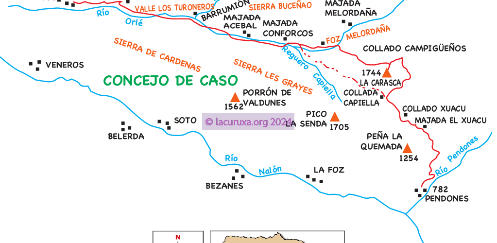 Salimos de Orlé (670 m), aldea del concejo de Caso, por un camino carretero que se dirige hacia el E, por el valle del río Orlé. El paisaje es hermoso por los recodos del camino, el medio bosque y el rumor del agua; pasamos varias veces a una y otra orilla del río. El valle discurre encajonado, el río se hace más profundo, pronto aparece la majada Acebal y un poco más adelante la majada Conforcos.