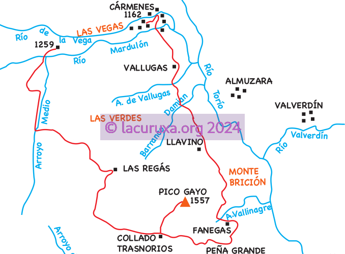 En las cercanías del pueblo de Cármenes, en la Comarca de Los Argüellos, (zona declarada Reserva de la Biosfera), al norte de la provincia de León. Se inicia una ruta circular alrededor del Pico Gayo completamente señalizada en todo el recorrido mediante postes con flechas indicando la dirección, así como el tiempo y kilometraje que nos queda por recorrer, balizas de madera cada pocos tramos para no perder el camino y de carteles interpretativos que nos ayudan a comprender mejor todo lo que te puede ofrecer la ruta.