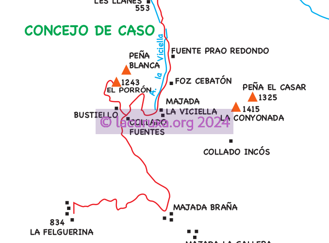 El camino, con rumbo NE, nos conduce hacia la foz Cebatón, formada entre los contrafuertes de peña Blanca y peña el Casar. El camino discurre junto al arroyo la Viciella por un bonito hayedo, con tramos del camino empedrado, salimos de la foz y, un poco más abajo, llegamos a la fuente Prao Redondo, junto a la misma hay una cabaña de piedra. Más adelante hay una bifurcación con una amplia pradería donde sale una pista hacia el N, que recorre el estrecho valle la Viciella, discurre entre avellanos y castaños, cruzando varias veces el arroyo la Viciella, pasamos un antiguo cargadero de mineral y finalmente llegamos al caserío les Llanes (553 m), donde se encuentra una apretada foz y el río Nalón desaparece al introducirse en una gran oquedad, conocida como Cueva Deboyu.