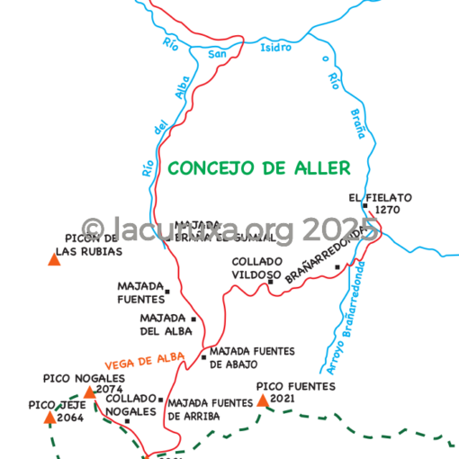 Desde aquí, con rumbo NE, ascendemos hacia el Collado Faidiellu, antesala del Pico la Carba, que podemos ascender con facilidad. Seguimos en busca del Collado Lechugueru, por un camino que discurre, a media ladera, hacia una pequeña angostura entre dos piedras, lugar conocido como Punta Lechugueru; más adelante llegamos a la fuente Lechugueru y a la majada de Llagos, estratégica atalaya con cabañas, cuadras y algún tejo en medio de la pradería.