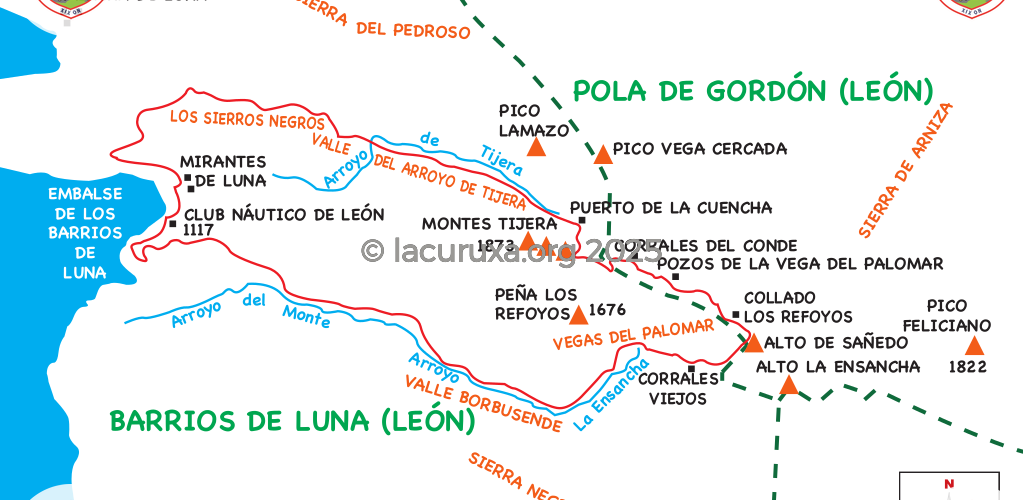 Mirantes de Luna, pueblo leonés, anegado a mediados del siglo XX por la construcción del Embalse de Barrios de Luna, era un pueblo espacioso, de casas de piedra con corredores a la solana. Nada queda de lo que fué Mirantes de Luna, salvo la iglesia situada en lo alto del pueblo, dedicada a San Mamés, y un gran tejo que todavía custodia su puerta de acceso. Su espacio se ha transformado y es ahora el Club Náutico de León. En el entorno de Mirantes, junto al Club Náutico (1117 m) iniciamos esta ruta que discurre por el Valle de Borbusende con su majada en los pastos altos y sus laderas pobladas de un bosque abierto de sabina albar, asentado sobre crestones de caliza gris, vemos un refugio a nuestra izquierda.