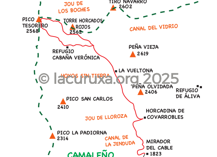 Desde el refugio seguimos hacia el NO, al cordal que divide los Hoyos Negros, llegando a la cumbre del Pico Tesorero (2568 m) que deslinda las tres provincias: Cantábria, León y Asturias y posiblemente sea el mejor mirador de los Macizos Central y Occidental de Picos de Europa.