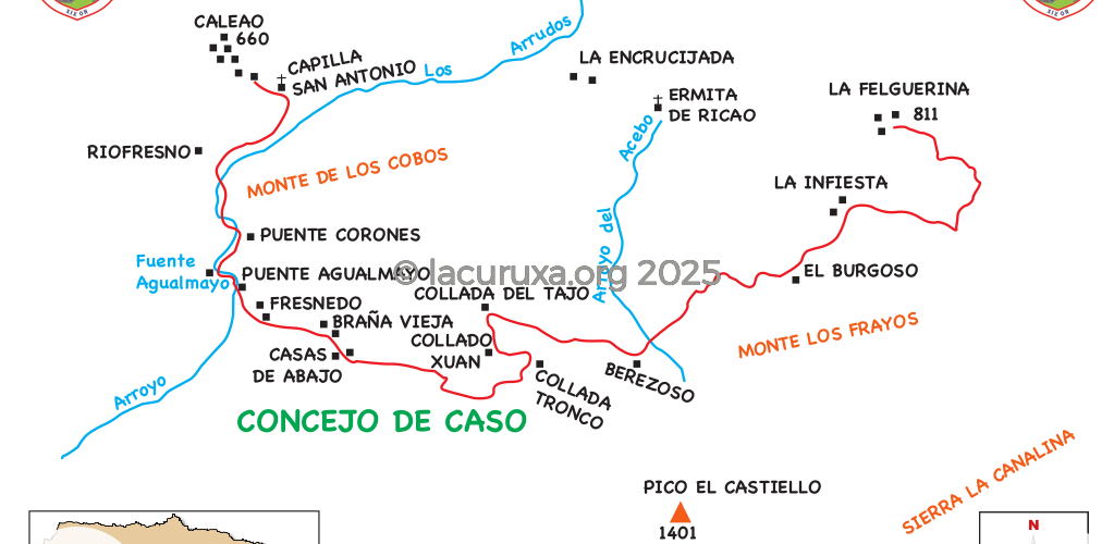 La Felguerina, aldea del concejo de Caso situada a 811 m de altitud; es donde iniciamos esta salida, por la parte alta del pueblo, tomando una pista que discurre hacia el SE, pasando junto al cementerio, el camino va alternando bajadas y subidas con algún tramo llano, rodeados de un precioso bosque, que nos conduce al núcleo rural de La Infiesta; muy cerca de allí, se encuentra la Ermita de Ricao (s. XIII).
