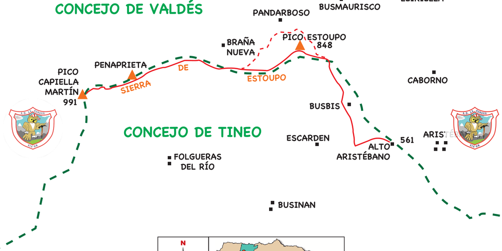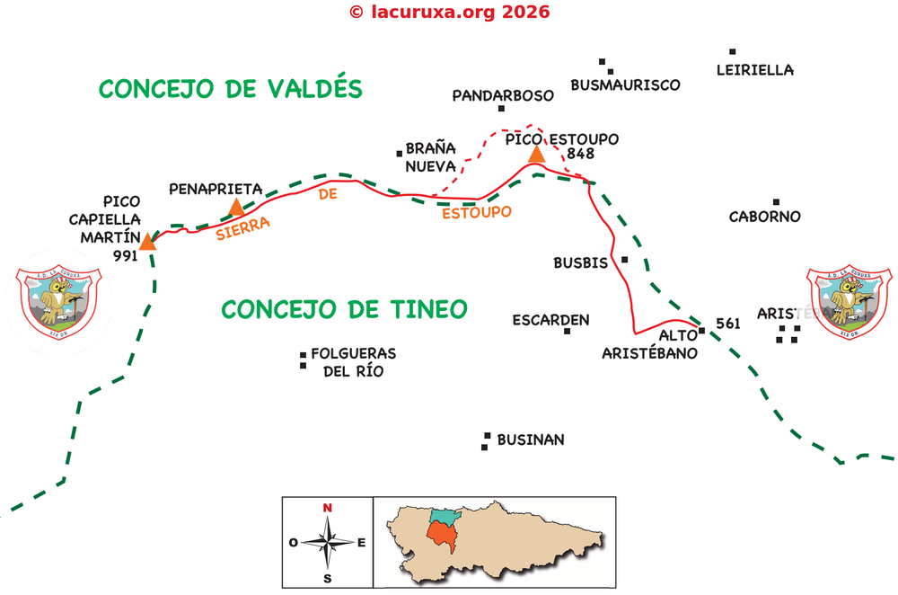 Desde el pico Estoupo seguimos hacia el O, por una pista, hacia un collado (667 m) y volvemos a subir, alcanzando la cima del pico Couzrago. Continuamos por un claro sendero, en cómoda subida, pasando por debajo de Penaprieta y, más tarde, alcanzamos la cumbre del pico Capiella Martín (991 m), siendo este el techo del concejo de Valdés.