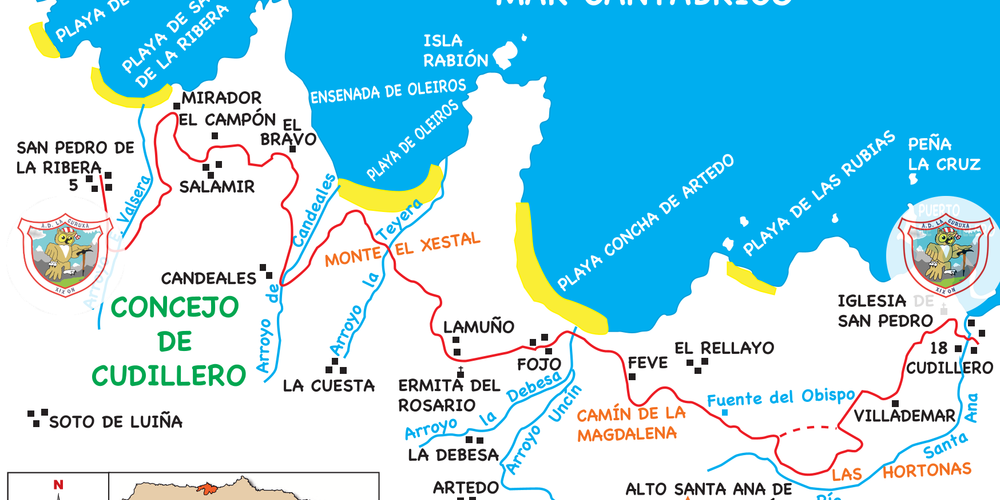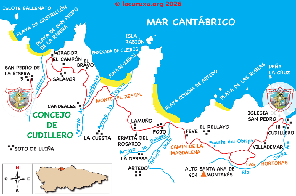 Aquí cruzamos la carretera y entramos en la zona del Rellayo, seguimos una pista; al poco tiempo encontramos la fuente del Obispo, punto más alto de la ruta (191 m). A la altura de las Hortonas nos lleva a la carretera N-632, giramos hacia la izquierda, luego en la rotonda, tomamos la primera salida en dirección Cudillero. A unos 300 m abandonamos la carretera, a la derecha sale un camino que nos lleva a la localidad de Villademar. Cruzamos el pueblo hacia el E, luego por una pista que va al N, más tarde se convierte en sendero, cruzamos unas praderías, con la vista puesta en una columna de alta tensión, al llegar a su altura, seguimos un sendero muy marcado, desde el cual vemos el pueblo de Cudillero a nuestros pies, con una espectacular vista panorámica. Solo nos resta bajar unos cuantos empinados escalones y llegar junto a la iglesia de San Pedro de Cudillero (18 m), donde finalizamos esta salida.