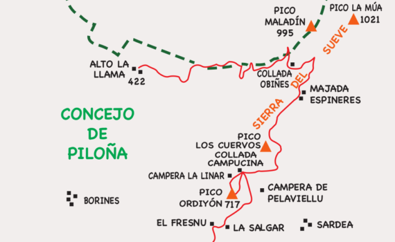 Iniciamos esta salida en el Alto de la Llama (422 m) donde tomamos una pista, con rumbo SE., que asciende entre praderías y arbolado. Pronto la pista se empina hasta alcanzar una pequeña campera, recorre un tramo bastante llano para volver a empinarse salvando el desnivel con varias revueltas que […]